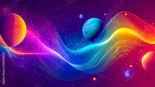 © Fatema, Fototapeta premium Vector illustration of glowing planets, stars, and abstract waveform with cosmic effects and vibrant colors