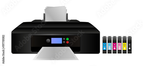 Obraz premium Vector illustration of home digital inkjet printer with cmyk and other light inks for a larger gamut