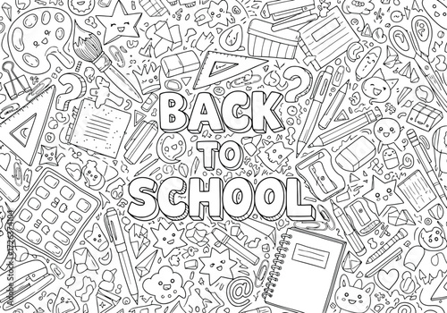 © Riyal, Obraz premium Vector illustration of intricate black and white doodle pattern with back to school text and numerous school supply elements