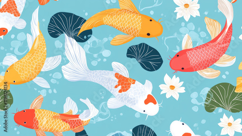 © wowowo, Naklejka premium Vector illustration of koi fish, simple flat style with simple lines, on a blue background with lotus leaves and water lilies in the corners. Each koi fish is in a different color, depicted in a top-d