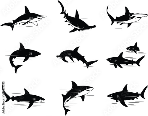 Fototapeta premium Vector illustration of shark silhouettes in different swimming poses, ocean predator design, hammerhead and great white shark collection, underwater wildlife marine concept art