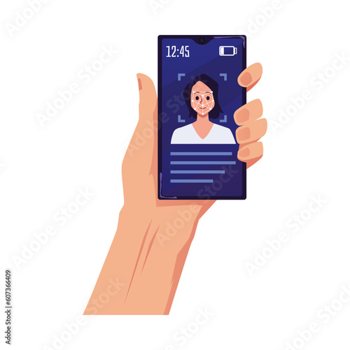 Fototapeta premium Vector illustration of the hand with the mobile phone shows the authorization program by the facial biometrics recognition system, isolated on white background