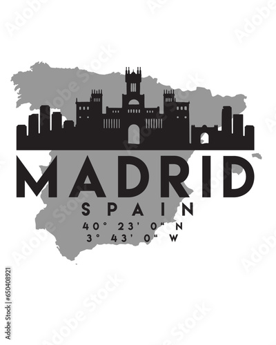 Obraz premium Vector illustration of the Madrid city skyline silhouette on a map with the coordinates