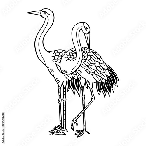 Naklejka premium Vector illustration of two standing cranes with detailed feathers. Perfect for nature themes, wildlife art, tattoos, and decorative design.