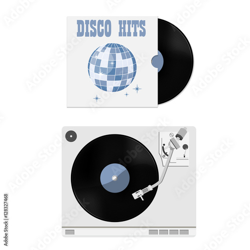 © viktorijareut, Obraz premium Vector illustration of vinyl record in cover with party disco ball hits. Vinyl player with vinyl record vector, record player, old, disco, gramophone