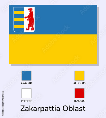 © Cipta, Obraz premium Vector Illustration of Zakarpattia Oblast flag isolated on light blue background. Illustration Zakarpattia Oblast flag with Color Codes. As close as possible to the original. vector eps10.