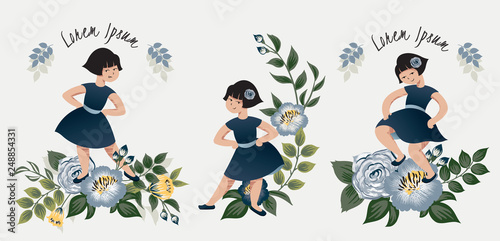 © Jung Suk hyun, Naklejka premium Vector illustration set of girls and flowers for Wedding, anniversary, birthday and party. Design for banner, poster, card, invitation and scrapbook