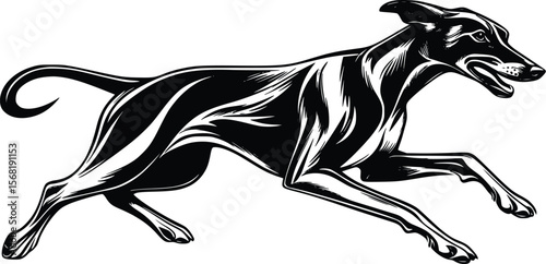 Obraz premium Vector illustration: Sleek black Greyhound, dynamic running pose, artistic style.
