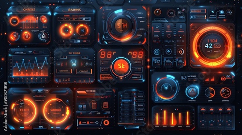 Fototapeta premium vector, illustration, User interface elements set for Smart home mobile app or web. Kit template with HUD, automation system, remote monitoring, room thermostat control, security. Pack of UI, UX, GUI.