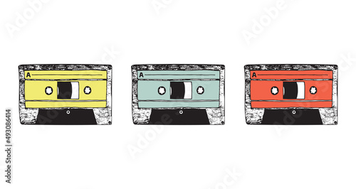 © Anastasiia Komarova, Naklejka premium Vector illustration with cassettes. Doodle sketch. Retro thing.