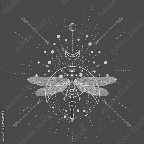 © nadezhdash, Obraz premium Vector illustration with hand drawn Dragonfly and Sacred symbol on black background. Abstract mystic sign. White linear shape. For you design, tattoo or magic craft.