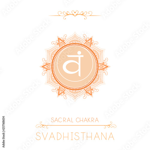 © nadezhdash, Fototapeta premium Vector illustration with symbol Svadhishana - Sacral chakra and decorative elements on white background.