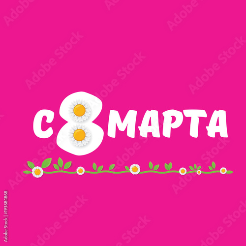 © zmiter, Naklejka premium vector International Women s Day label isolated on pink background with Russian language lettering text. 8 march greeting card or banner design
