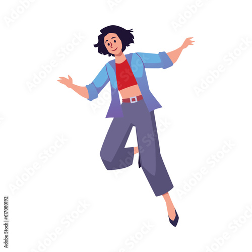 Fototapeta premium Vector isolated illustration of girl makes a jump, flies, happy energetic woman in action, moving with joy, free flight dreams