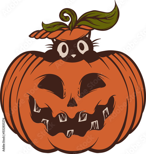 Obraz premium Vector jack-o'-lantern showing black cat head poking through pumpkin lid,...