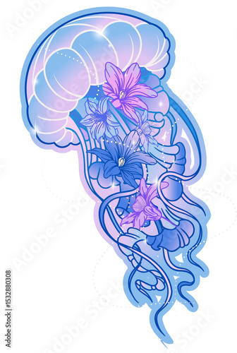 © vectorfusionart, Obraz premium Vector jellyfish floating in pastel hues with lilies, stars and dotted curves on clear background