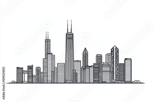 Naklejka premium Vector line drawing of a city skyline on a white background, in a simple...