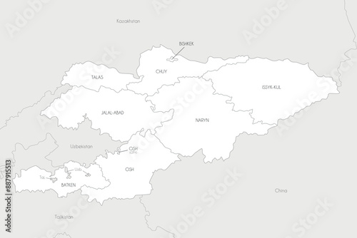 © asantosg, Fototapeta premium Vector map of Kyrgyzstan with regions and administrative divisions, and neighbouring countries and territories. Editable and clearly labeled layers.