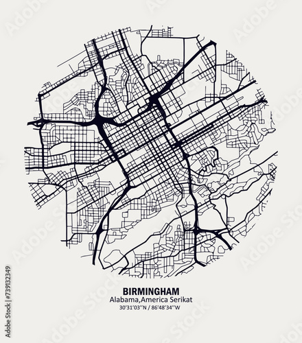 Naklejka premium vector map of the city of Birmingham, Alabama, United States. Black and white for home walls and posters
