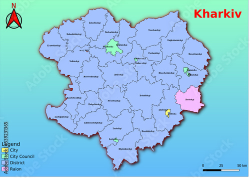 © M&M Baciu, Fototapeta premium Vector map of the Ukraine administrative divisions of Kharkiv Region with City, City Council, District, Raion
