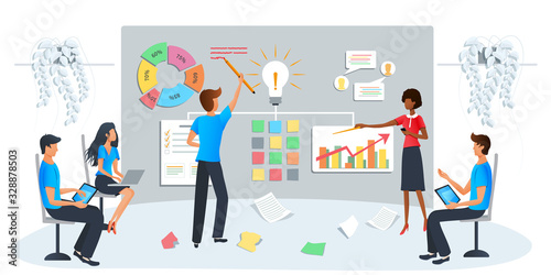 Fototapeta premium Vector modern illustration of business workshop, training. Team brainstorming the idea at workshop event. Startup new business project. Data analysis, employee studying company analytics