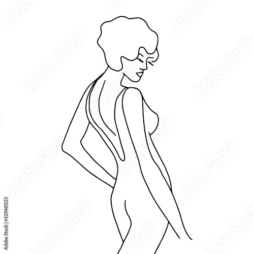 © Анна Комелева, Fototapeta premium Vector modern line art of woman. Vintage art deco hand drawn simple illustration for promotional items, posters, fashion t-shirt design, printing, posters, invitations, cards, leaflets. Isolated on