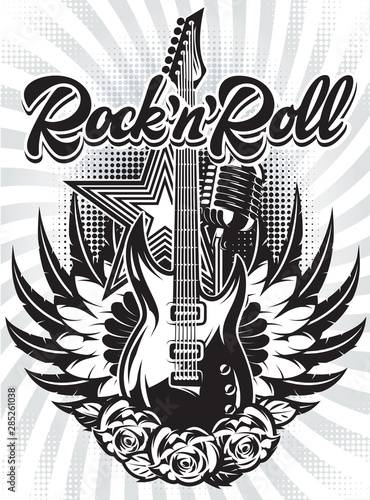 © 111chemodan111, Fototapeta premium Vector monochrome illustration with guitar, tape and text