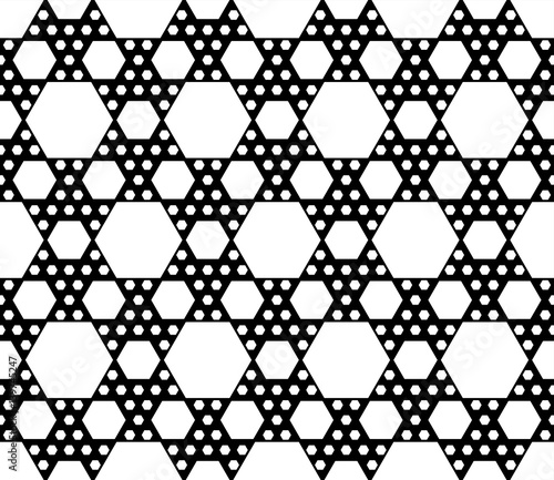 © Olgastocker, Naklejka premium Vector monochrome seamless pattern, repeat geometric texture, black & white hexagonal grid, abstract modern wallpaper. Background with simple figures, hexagons. Design for decoration, prints, textile.