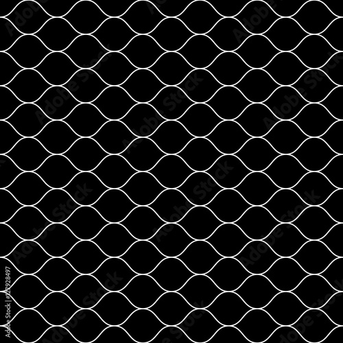 © Olgastocker, Fototapeta premium Vector monochrome seamless pattern, white thin wavy lines on black backdrop. Illustration of mesh, fishnet. Subtle dark background, simple repeat texture. Design for prints, decoration, digital, web