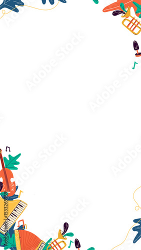 Fototapeta premium Vector music frame showing instruments, notes, leaves and cable on...