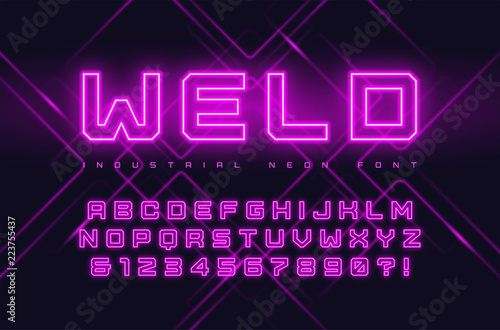 Obraz premium Vector neon industrial style display typeface, font, alphabet