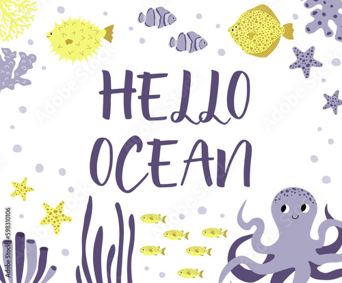 © Оксана Омельченко, Naklejka premium Vector ocean illustration with octopus,flounder,clown fish,starfish,coral.Hello ocean - modern lettering.Underwater marine animals.Ecology design for banner,flyer,postcard, website Generative AI