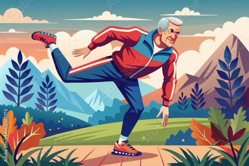 Obraz premium vector of An old fit athlete in tracksuit balancing on one foot and stretching it while preparing for fitness in nature.