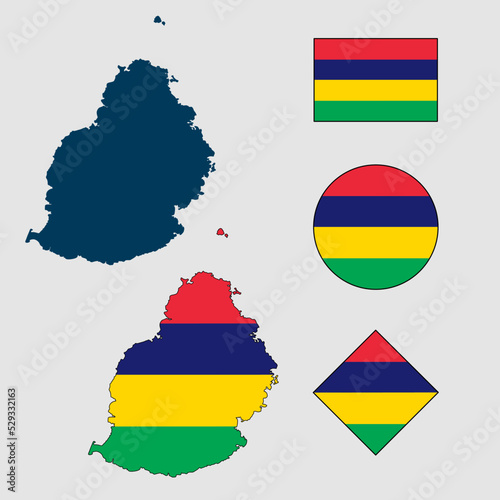 © Azizah, Obraz premium Vector of Mauritius country outline silhouette with flag set isolated on white background. Collection of Mauritius flag icons with square, circle, rectangle and map shapes.