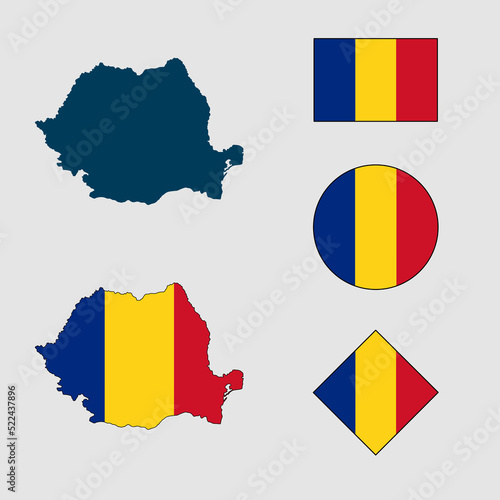 © Azizah, Obraz premium Vector of Romania country outline silhouette with flag set isolated on white background. Collection of Romania flag icons with square, circle, rectangle and map shapes.