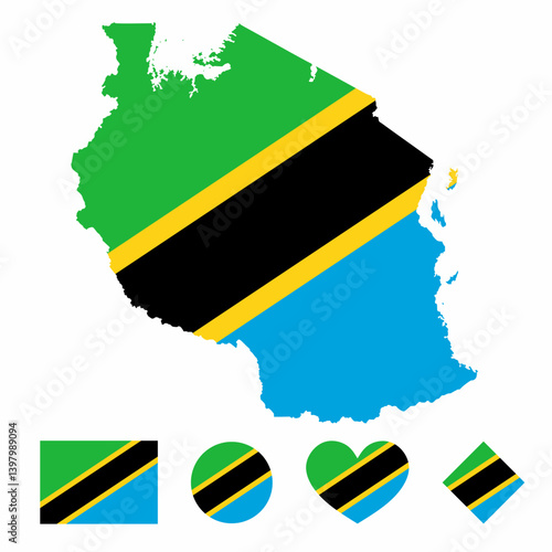© Azizah, Obraz premium Vector of Tanzania map flag with flag set isolated on white background. Collection of flag icons with square, circle, love, heart, and rectangle shapes.