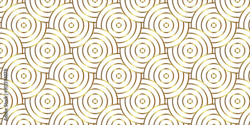 © MdLothfor, Naklejka premium Vector overlapping Pattern Minimal diamond geometric gold color spiral line waves abstract wave line. seamless gold line tile stripe overlap creative retro circle line fabric pattern white background.