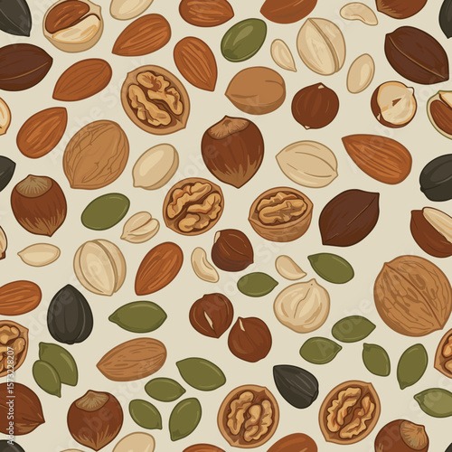 © Neyro_jm_st, Obraz premium Vector pattern of assorted nuts and seeds, repeat design, muted natural colors