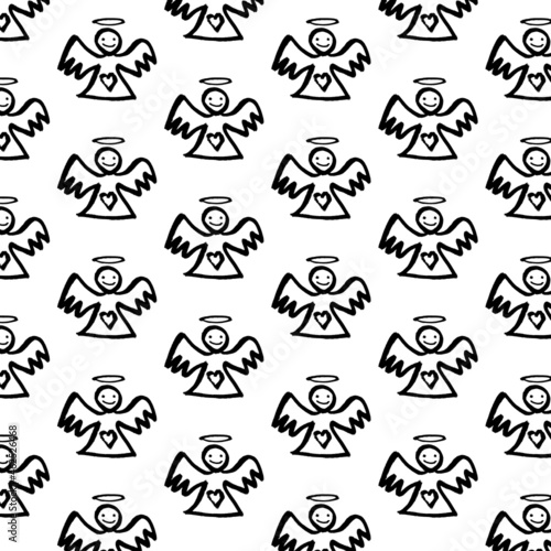 © Julia Kuts, Naklejka premium Vector pattern with angels. Hand drawing, ink style. Sketch, doodle. Christmas, New Year. Winter. Black on white background