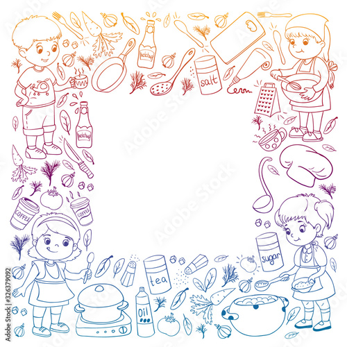 © rudut2015, Fototapeta premium Vector pattern with cooking class for little children. Kids icons. Healthy eating.