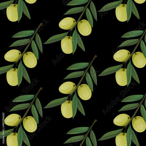 © Alla, Naklejka premium Vector pattern with green olives on black background.