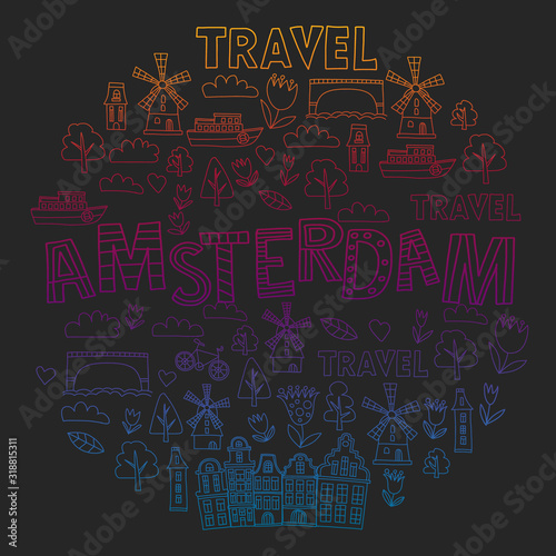 © rudut2015, Obraz premium Vector pattern with Holland, Netherlands, Amsterdam icons. Doodle style.
