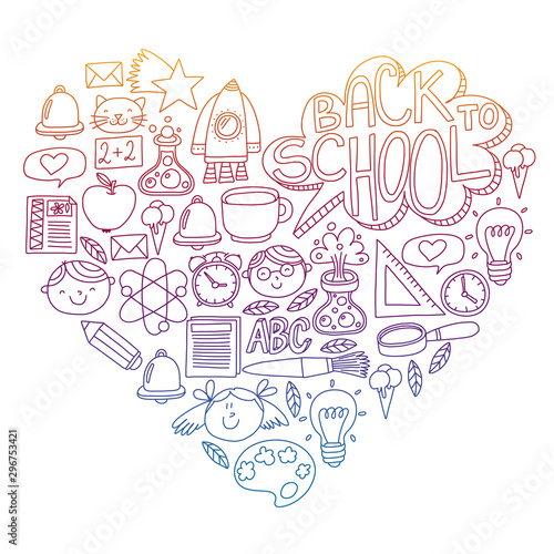 © Anastasia, Fototapeta premium Vector pattern with school icons with little students. Children study chemistry, creativity, mathematics, physics, algebra, geometry, biology, geography, astronomy.