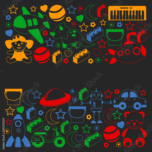 Fototapeta premium Vector pattern with the collection of toys. Doll, submarine, plane, ship. Children and kindergarten illustration.