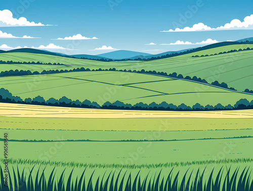 Fototapeta premium Vector Peaceful Countryside with Rolling Fields and a Clear Sky: Anime Clean...