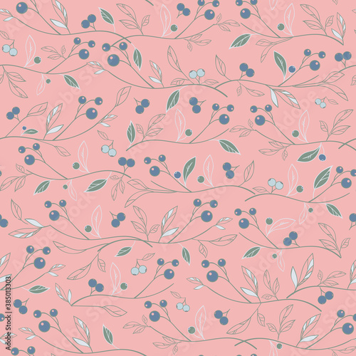 Fototapeta premium Vector pink leafs and berries seamless background ornament texture.
