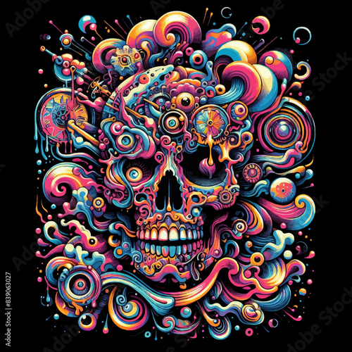 Obraz premium Vector psychedelic vibrant skull t shirt design