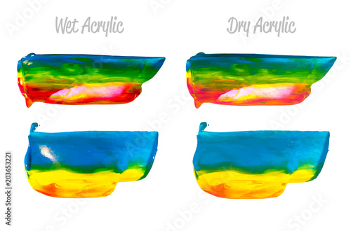 © Octostockus, Obraz premium Vector purple, blue, yellow paint smear stroke stain set. Abstract acrylic textured art illustration. Acrilyc Texture Paint Illustration. Hand drawn brush strokes vector elements. Acrilyc strokes.