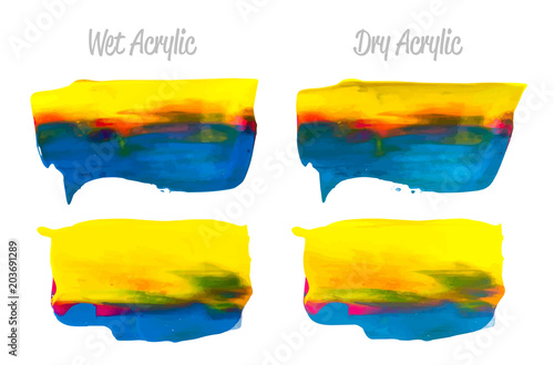 © Octostockus, Obraz premium Vector purple, blue, yellow paint smear stroke stain set. Abstract acrylic textured art illustration. Acrilyc Texture Paint Illustration. Hand drawn brush strokes vector elements. Acrilyc strokes.