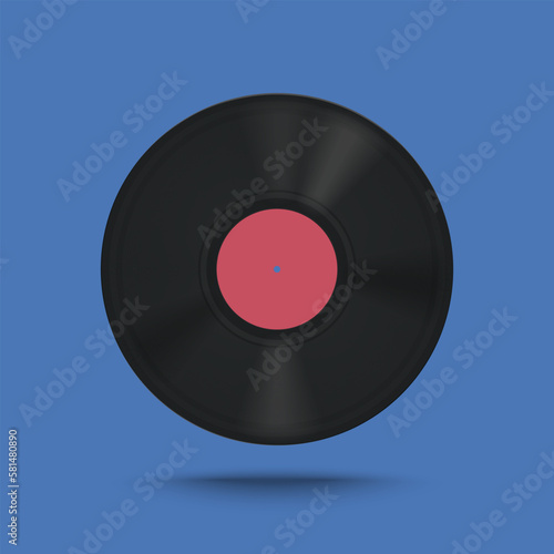 Obraz premium Vector realistic illustration of black vinyl with red label on blue background.